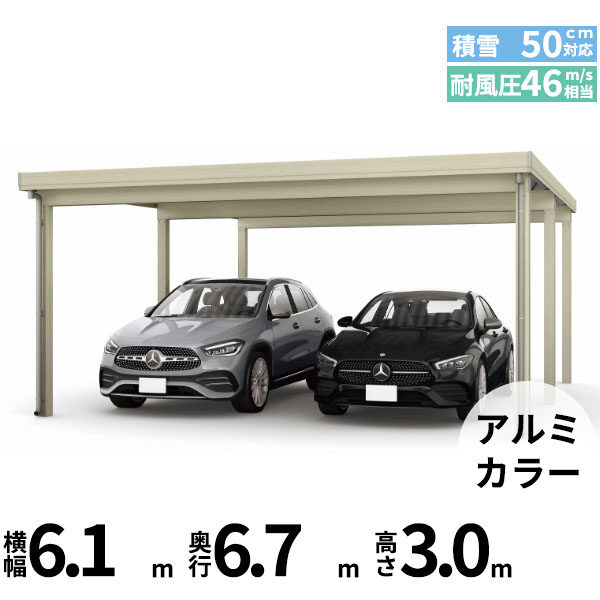 寸法バリエーションは奥行が5450mmと5960mm、間口が4904mm、5504mm、6104mm、高さが2355mm、2500mm、3000mmの3種類から選べ、お住まいのスペースや車両に合わせて最適なサイズを選ぶことができます。また、風速46m/秒相当の耐風性能と耐積雪50cm相当の性能を備え、厳しい気象条件にも対応可能です。
