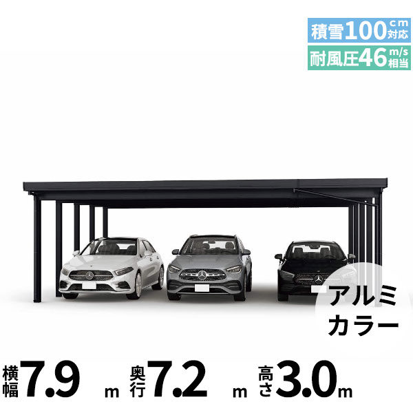 【商品のみ】カーポート 3台用 YKK YKKAP ジーポート Pro 3000タイプ 横材なし 明かり取りなし 単体柱8本 55-80 H30 アルミ色