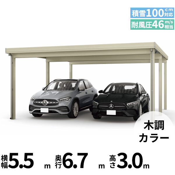 【商品のみ】カーポート 2台用 YKK YKKAP ジーポート Pro 3000タイプ 横材なし 明かり取りなし 間口延長柱6本 E55-55・18 H30 木調色