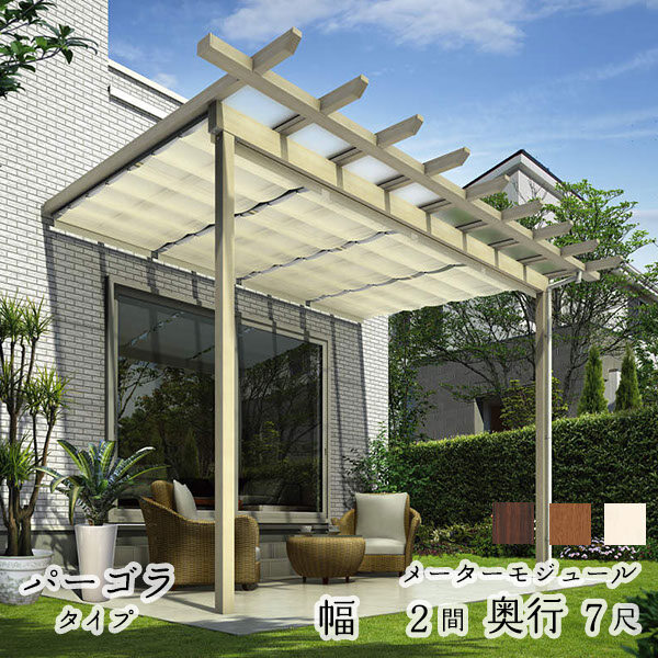 YKK YKKAP サザンテラス パーゴラタイプ+天井カーテン+操作フック棒セット メーターモジュール 600N/m2 2間×7尺 ポリカ屋根 後付け『 テラス屋根 パーゴラ サンシェードカーテン付き 』